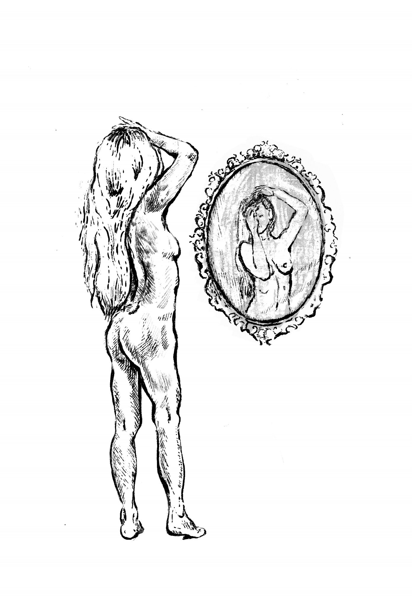 Olen vannitoas. See on üks võõras agul. Seisan peegli ees alasti – järelikult ei taha ma midagi varjata (aga „tahet ei saa usaldada / ennast ei saa usaldada“). Tõstan üles parema käe ja ka kujutis minu vastas liigutab. Mina sirutan valge käe sirgelt taeva poole, aga minu vastas olev vasakpoolne valge käsi kehval kõhnal kehal jääb kuidagi kõveraks. Vannitoas on kõle ja õues vingub tuul, läbi ventilaatori kostub laste summutatud kisa – maailm jääb minust kaugele, maailm on kiviseina taga. Muudan fookuseid: jälgin rähma silmanurgas (on hommik), lotendavaid rindu (rinnanibud totralt lötakil, voodiriiete mustrid kehal), aga siis avastan otsmikult punni ja hakkan seda mitte millelegi mõeldes katkuma. Pressin mäda enda seest välja. Nagu Medusa pilgu kangestav puudutus. Pööran nüüd selja ja vaatan üle õla (kuigi Orpheuse asemel oleksin meelsasti Eurydike). Nüüd jääb mu esikülg (parim osa minust) varjatuks, nagu on varem varjatuks jäänud kogu alakeha. Sulen silmad. Üritan ette kujutada kujutist, mis veel äsja oli minu ees, aga mäletan üksnes üksikuid detaile – kes ehitaks sest üles terviku, naise, inimese?