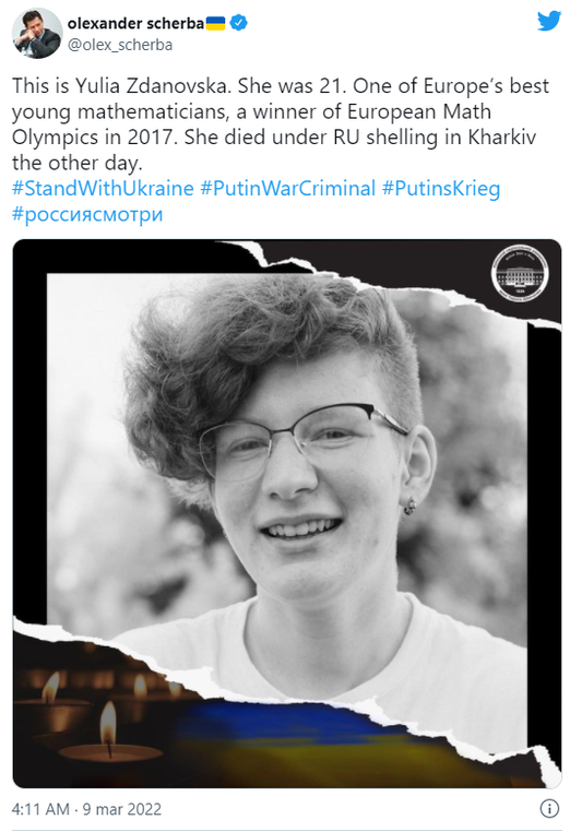 Nagu paljud teisedki, suutsin mõelda ainult neist fotodest. Rasedad naised, keda Mariupoli sünnitusmajast välja kantakse, massihauad, kuhu surnukehasid kiiruga laotakse, sest muul moel ei jõuta ümber piiratud ja rusudes linna surnuid matta, tekkidega kaetud surnukehad tänavatel. Pilt 21-aastasest Julia Zdanovskast, andekast matemaatikust, kes jäi Harkivisse vabatahtlikku tööd tegema ja sai pommitamise käigus surma.